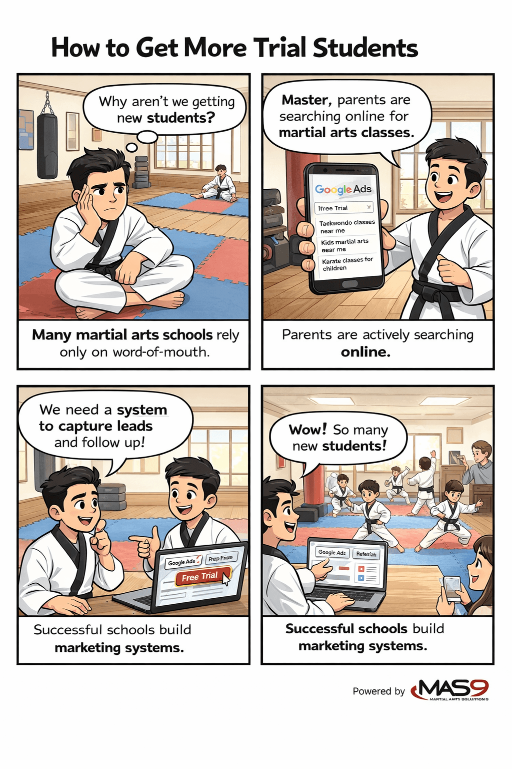 Running a successful martial arts school requires a steady stream of new students. Many school owners rely only on word-of-mouth, but the most successful schools build reliable marketing systems.